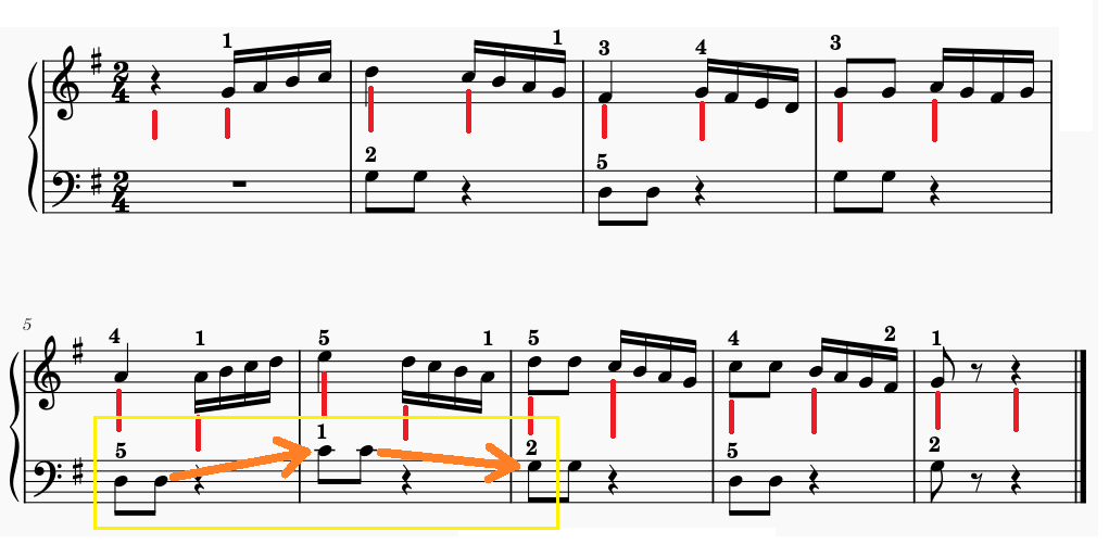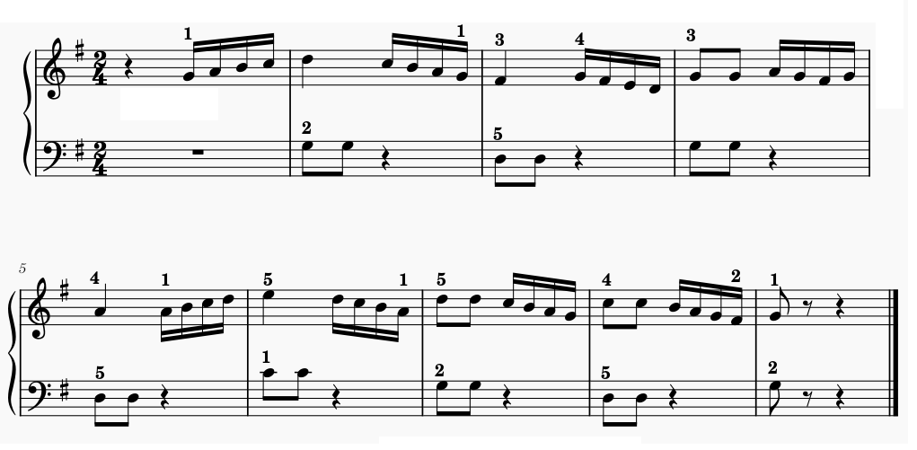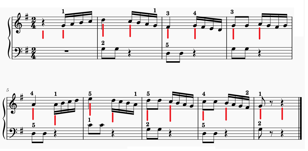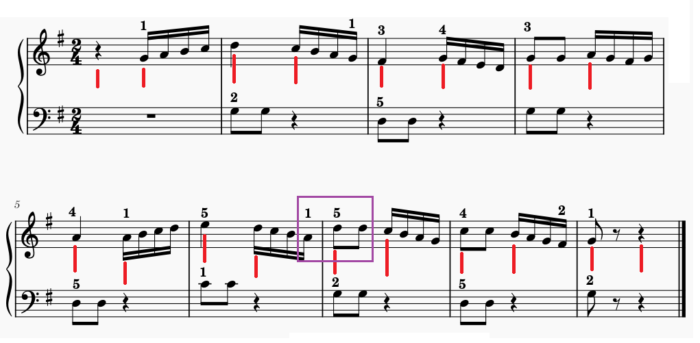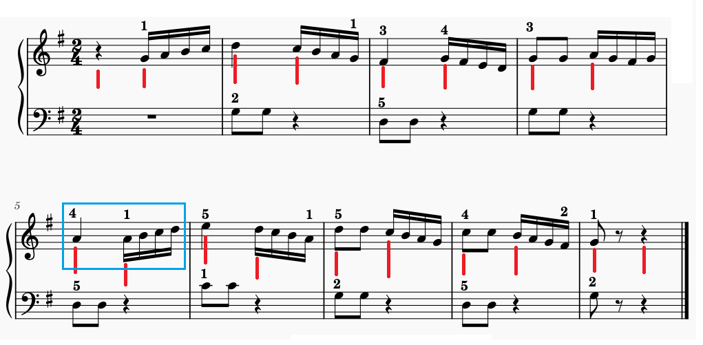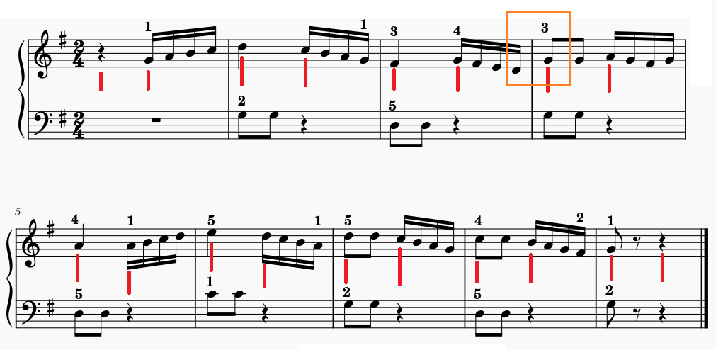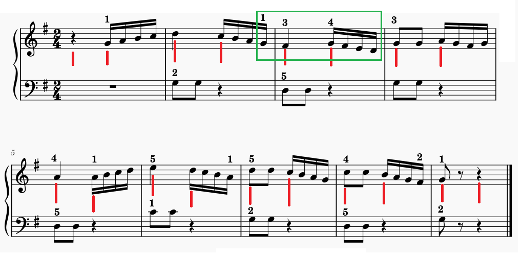 Qui il primo FA# della battuta viene eseguito con il 3° dito, che scavalca il pollice, che precedentemente ha suonato un SOL. Appena premerai il FA#, dovrai riposizionare immediatamente la mano allineandola ai tasti vicini, in questo modo ti troverai già con il 4° dito sul sol successivo.
